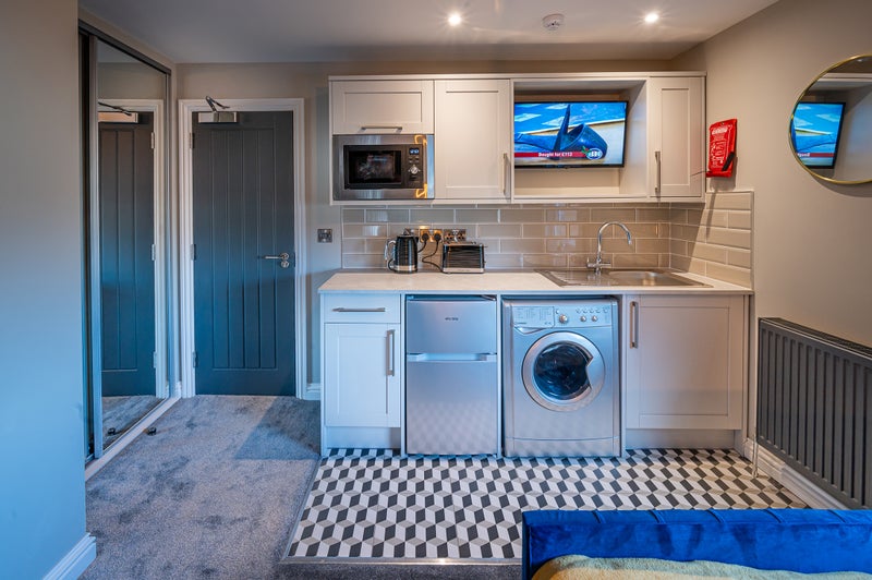 The studio has its own kitchenette afar from the bed area which is a modern and neutral grey. There is built in microwave, toaster, kettle, mini fridge/freezer, sink, cupboards & storage and washer dryer.