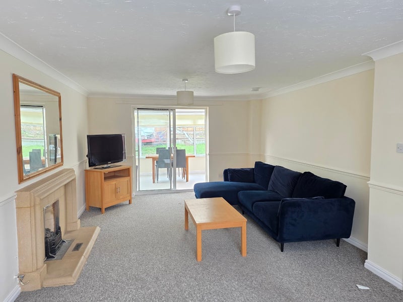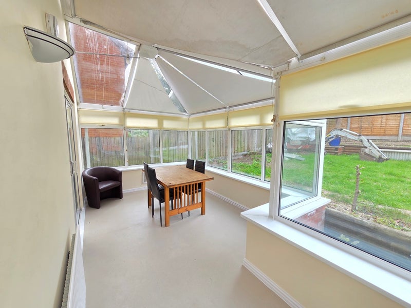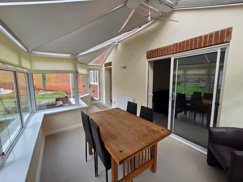 Additional communal spaces include a large separate living room furnished with sofas, as well as a bright conservatory offering dining facilities with table and chairs, ideal for shared living and socialising. Patio doors open out onto a rear garden, providing further outdoor space.