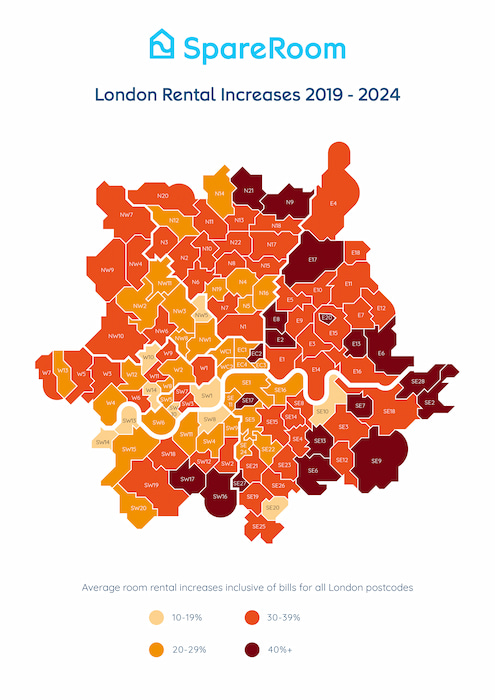 - New data from SpareRoom shows London rents have increased by an average of 32% in the past five years*